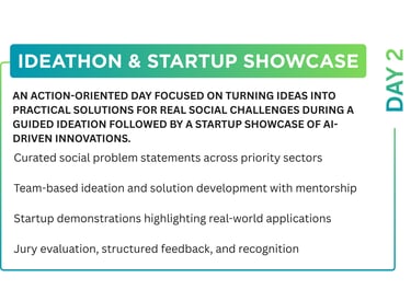 A core segment of the AI Social Transformation Forum 2026, that provides a structured platform to develop, refine, and present AI-driven solutions to real social challenges. Participants work with sector-specific problem statements, apply ideas in an outcome-oriented format, and learn from cross-sector experts, culminating in solution presentations within a national innovation forum. The segment offers recognition, visibility, and pathways for pilot projects, proof-of-concept development, and potential CSR or institutional collaboration.