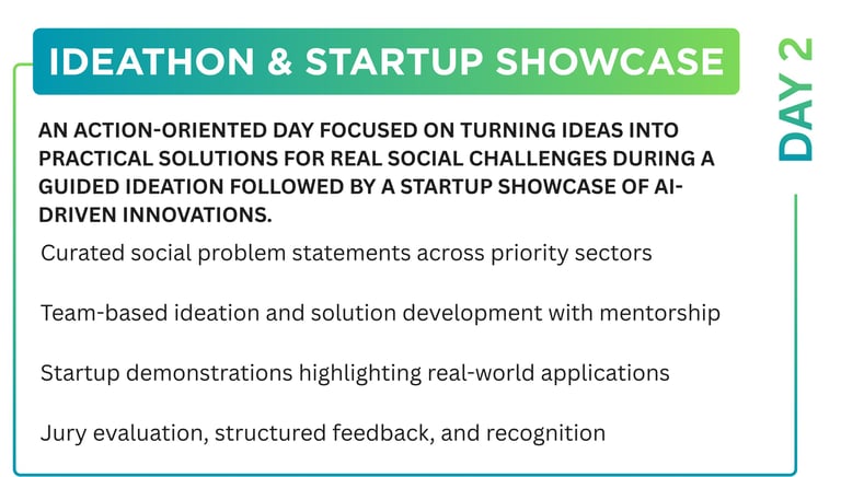 A two-day knowledge and collaboration platform that brings together academia, policymakers, industry leaders, startups, CSR teams, and civil society to explore ethical, inclusive, and scalable AI solutions for India’s development priorities across healthcare, education, and livelihoods.